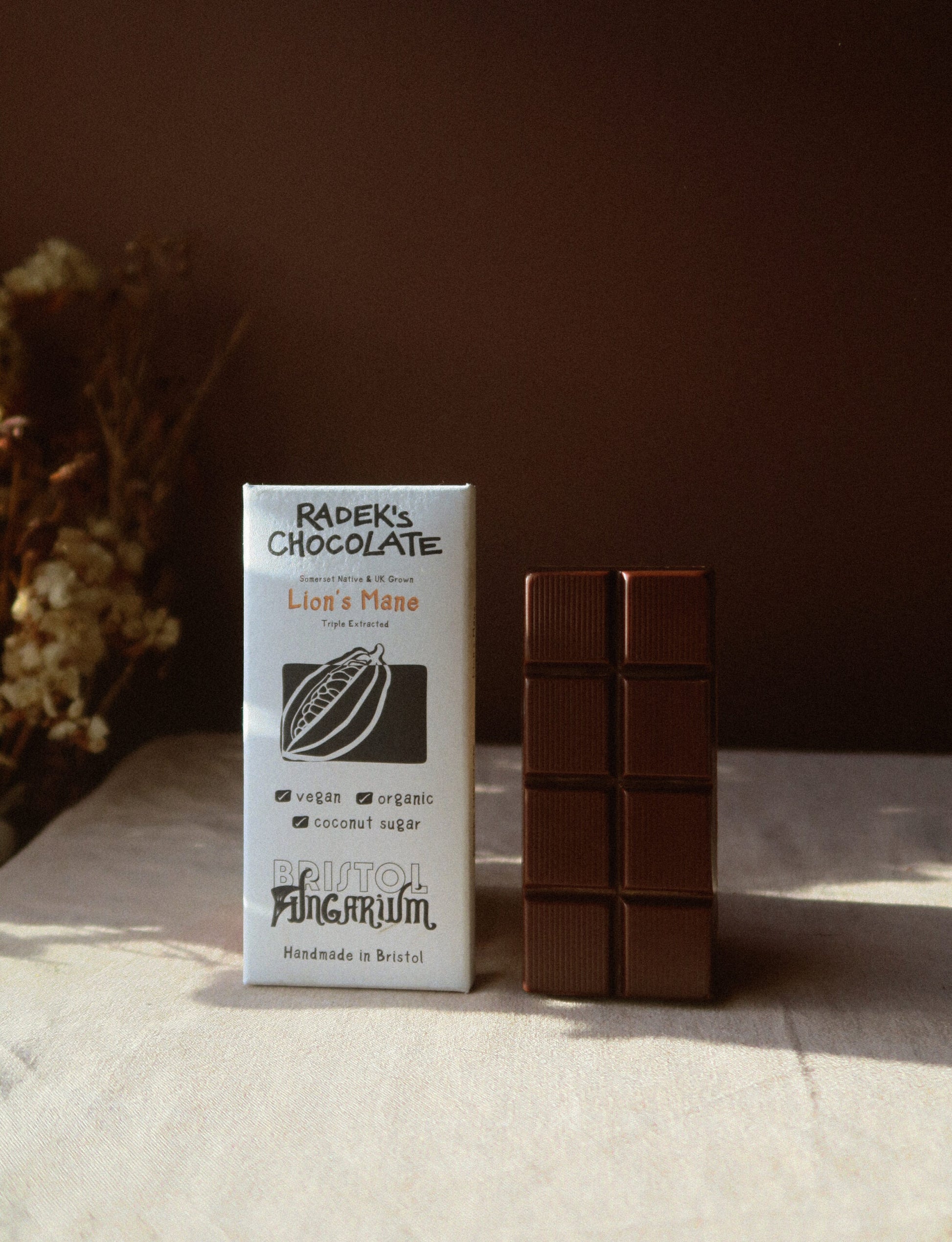 A super special collab between Radek's Chocolate & Bristol Fungarium. The team at Bristol Fungarium grow the only native lions mane in England, from an indigenous specimen found just 500m away from their mushroom farm in Somerset. Blending the uplifting effects of ethically-sourced cacao with Bristol Fungarium's locally grown and comprehensively extracted Lions mane powder provides a perfect meeting of ingredients that are full of antioxidants, betaglucans and unique compounds that are beneficial for cognition, mood, focus and energy.