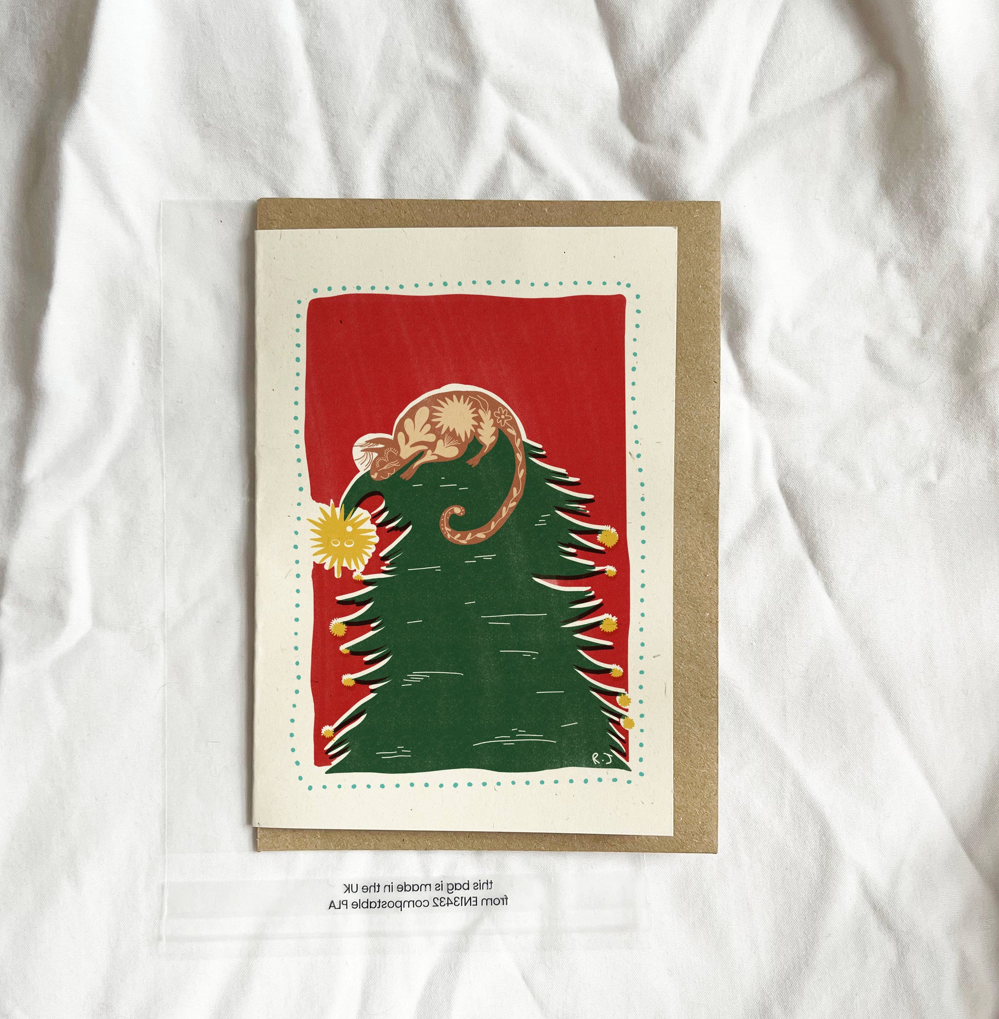 I didn’t plan for my pet to be at the top of my tree, but here we are! Embrace the folky spirit of the season with this fun and quirky Christmas card, featuring a cat peacefully sleeping in a Christmas tree. Printed on thick 300gsm card for a high-quality finish, this A6 card comes with a Kraft brown envelope and PLA compostable sleeve, ready to post to your nearest and dearest. A unique and fun way to share some festive cheer! PS this card stock is so nice because its unbleached, textured and has its natural paper flecks aka untampered and lovely!