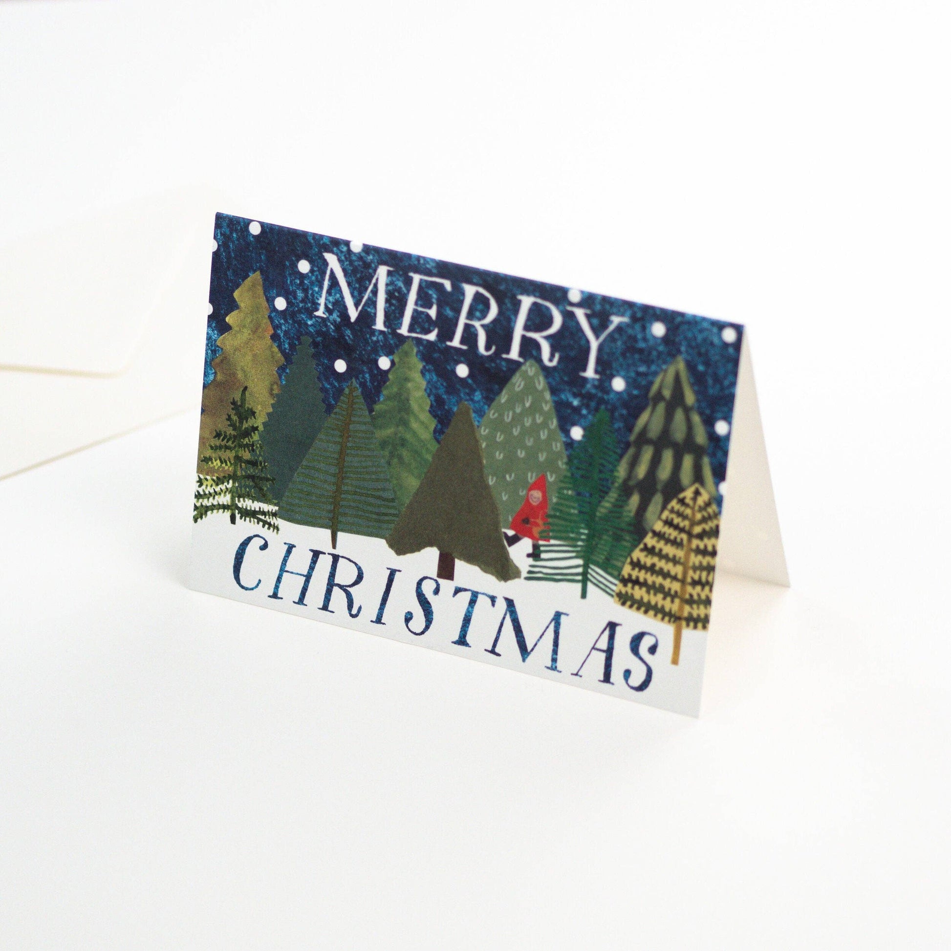 The perfect snowy winter woodland scene with a merry christmas message. Printed on high quality 300gsm card. Each card measures 11.5cm x 15cm when folded and comes in a handsome cream envelope, the inside is left blank for your own message.